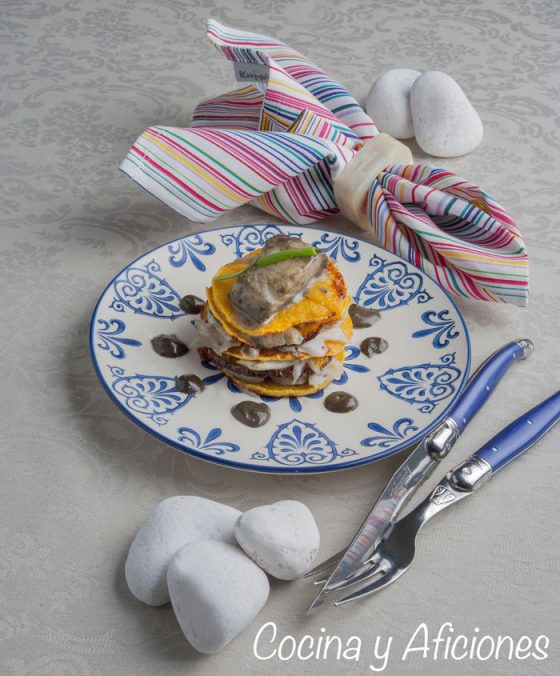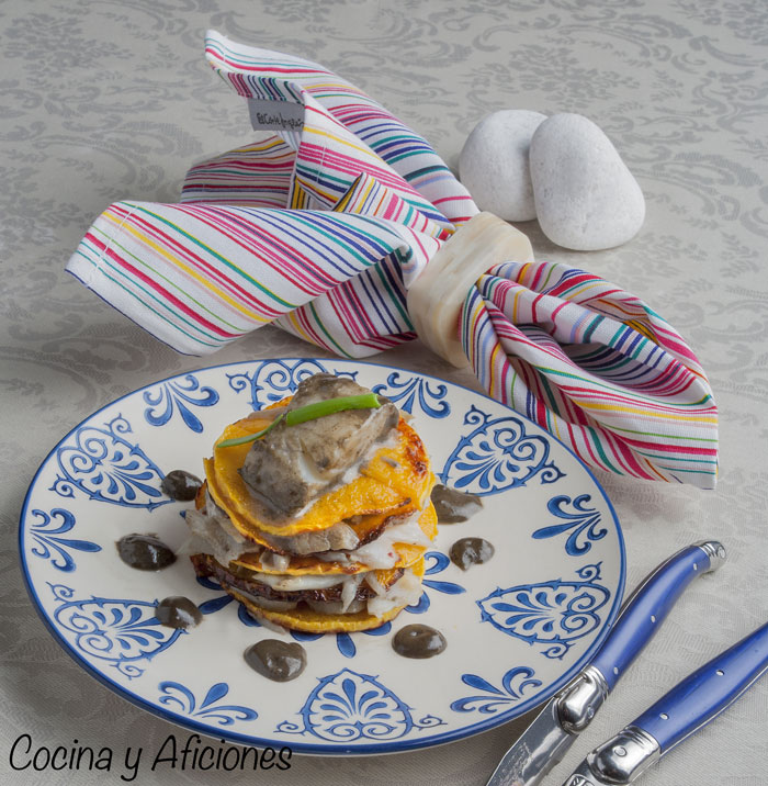 Lasaña de calabaza con bacalao  y mahonesa de ajo negro