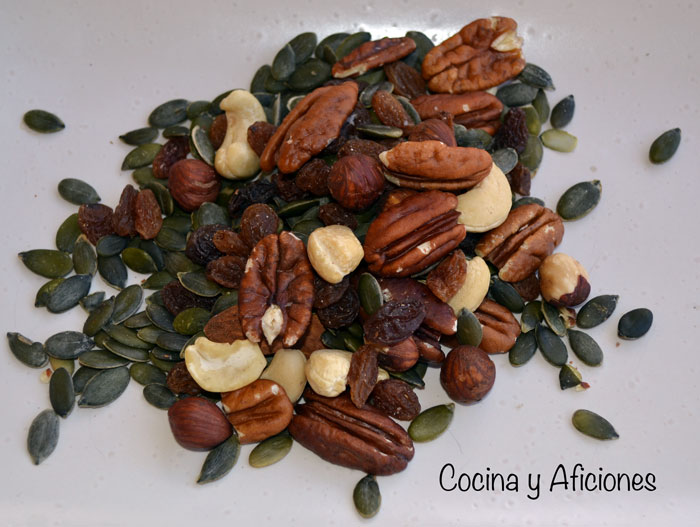 Para este plato he elegido “frutos secos crudos. 100% natural”, este envasado en atmósfera protegida lo que hace que su conservación sea óptima. Pruébalos solos, te van a encantar, como a mí, que me daba pena añadir los frutos secos al guiso ya que me apetecía comérmelos tomando el aperitivo, disfrutar tranquilamente con un buen vino blanco muy fresco y mi rico aperitivo de frutos secos y pasas.