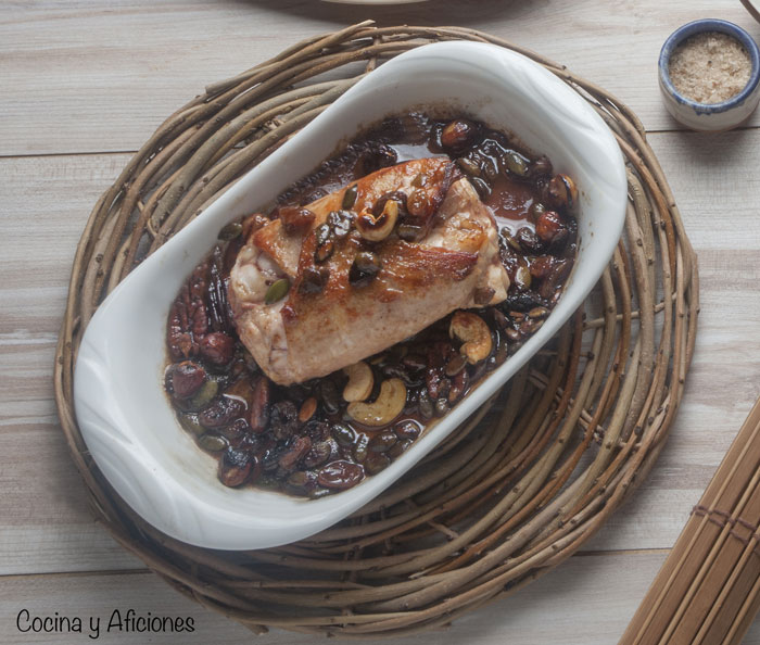 - Colocamos en la fuente de horno, añadimos los frutos secos y las pasas y regamos con el vino amontillado