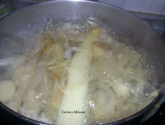 - Para los espárragos añadimos en el agua los restos que nos han quedado al pelarlos, les aportan un extra de sabor que no vamos a desperdiciar.