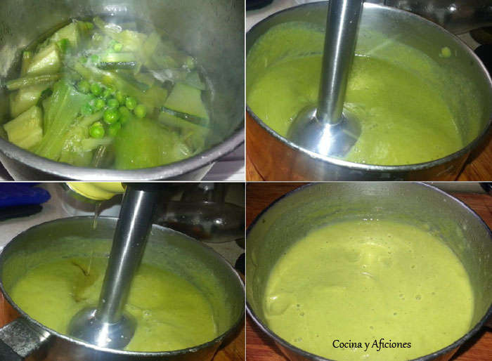 Crema: 250 gr. de calabacín, 150 gr de espinacas, 250 gr. de guisantes pelados, 250 gr. de judías verdes, 150 gr. de cebolla fresca.