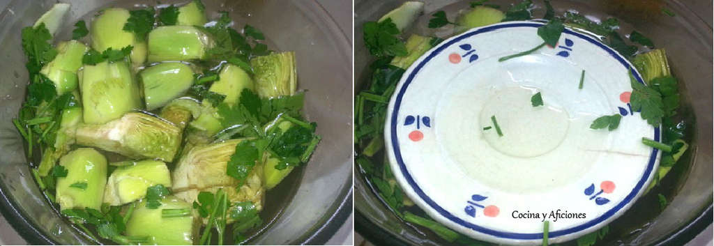 Picamos una cantidad generosa de perejil y la añadimos a un bol grande lleno de agua fría y ya podemos empezar a pelar las alcachofas. Les quitamos las hojas de fuera dejando solo el corazón, torneamos el tallo y partimos en cuatro. Introducimos rápidamente en el agua con perejil y no se nos pondrán negras ni tomaran sabores, como flotan siempre les pongo un plato por encima para que estén hundidas en el agua y no cambien de color.