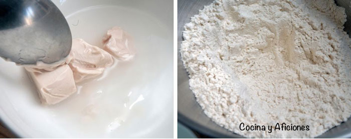 - Deshacemos la levadura en un cuenco con cuatro cucharadas de agua templada.