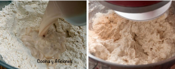 - Vertemos esta preparación, junto con el resto del agua tibia y la sal, en el hueco de la harina.