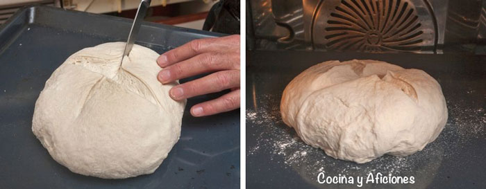 - Modelamos la masa, bien en forma de pan, y la colocamos en la bandeja del horno, previamente enharinada.