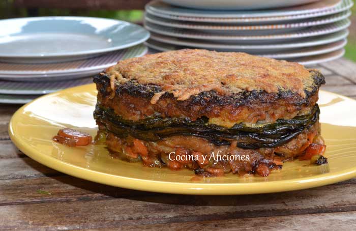 3.- Capa de berenjenas y calabacín: los cortamos en rodajas finas con la piel, las pasamos por la plancha vuelta y vuelta.