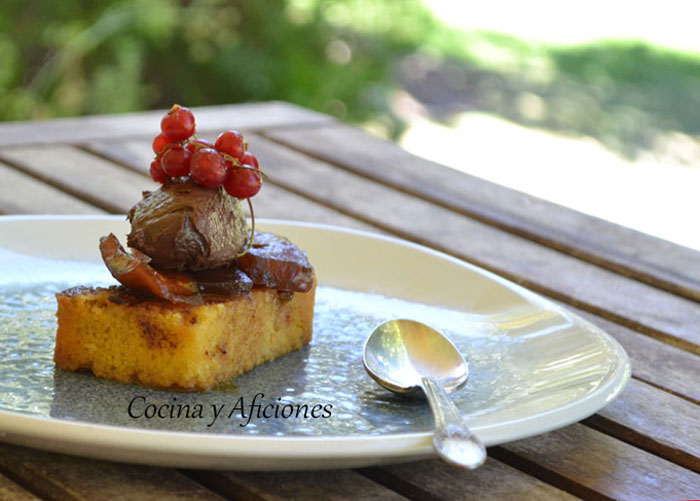 Cortar el bizcocho en porciones individuales, pinchamos el bizcocho y lo mojados con el ron de flambear las manzanas.