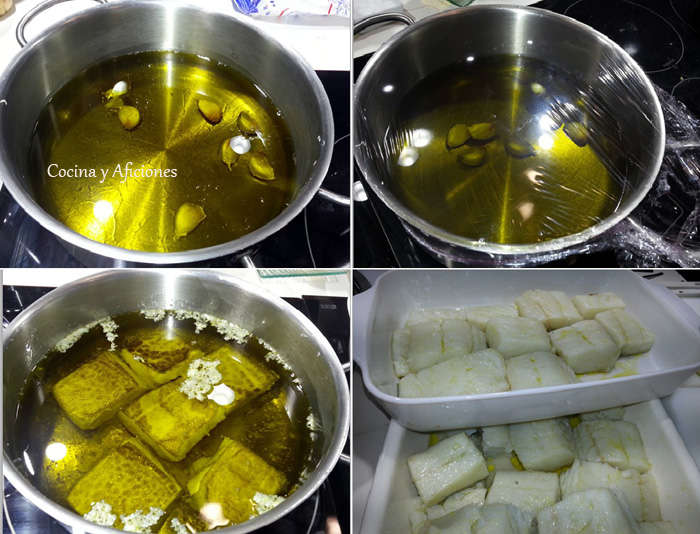 – Calentar el aceite en una sartén a unos 80º, incorporamos el bacalao y los ajos y confitamos hasta que el bacalao este en su punto y los ajos dorados. Retirar de la sartén.