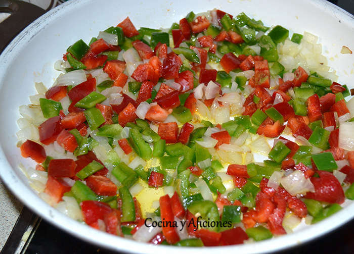 - Picamos en brunoisse (cuadraditos muy pequeños) la cebolla, los pimientos y el calabacín.
