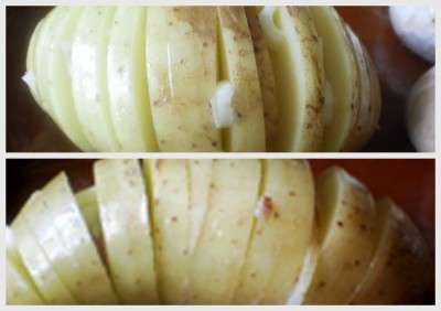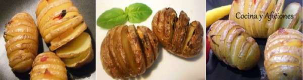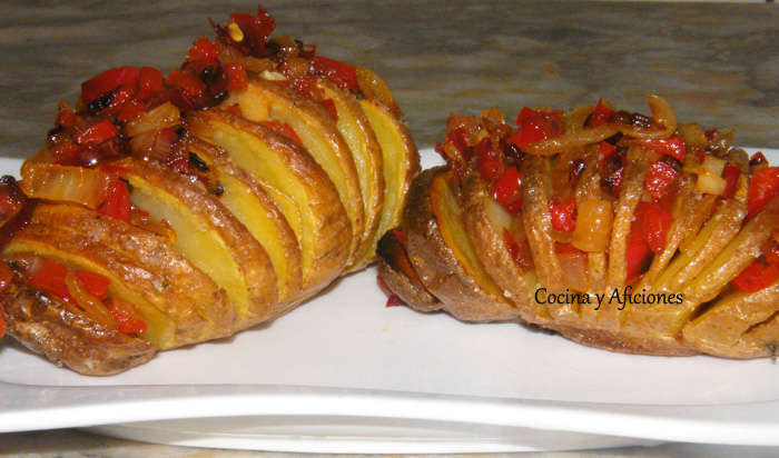 Estas “Patatas Hasselback o Patatas Acordeón” las he utilizado para acompañar a mi pollito con chocolate, quedaron tan bonitas y tan ricas que tengo que ponerlas aparte ya que en la otra receta el elemento principal era el pollo, estaban en segundo plano y una plato tan especial tiene que brillar con luz propia.