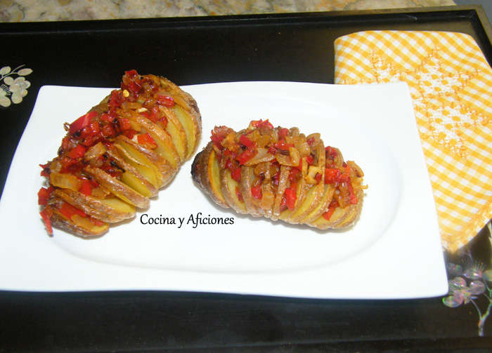 Con cuidado de no quemarnos vamos rellenando los huecos del acordeón patatero con las verduritas picantes, generosamente, también ponemos un poco por encima. Servimos calientes.