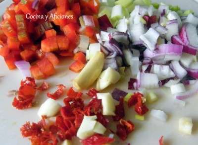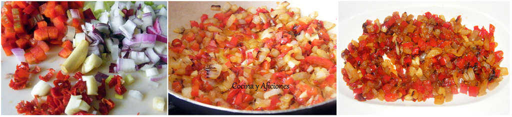 Cortamos súper minis la cebolla y los pimientos y lo ponemos a sofreír en una sarten, cuando la cebolla empiece a trasparentar le añadimos el ajo muy picado y la guindilla y terminamos de cocinar.