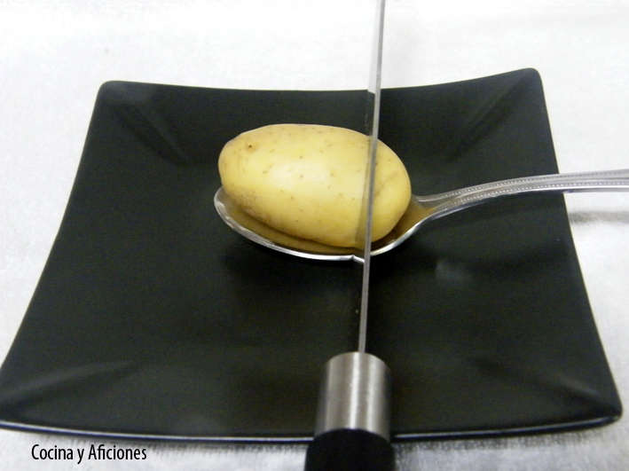 Ponemos la patata encima de una cuchara, con un cuchillo afilado procedemos a efectuar los cortes, al topar con el borde de la cuchara el corte nos quedar perfecto y no se rompera la patata.