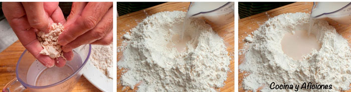 - Ponemos la levadura en un pequeño bol con un poco de agua templada y la deshacemos.