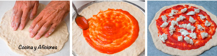 Extiende el tomate sobre la masa de la piza, reparte las cebollas y reparte el queso, al horno a 180ºC hasta que esté lista.
