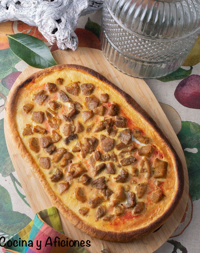 Es una masa de pizza al uso, aunque se le da forma ovalada o rectangular y se termina con huevo batido o con huevos fritos.