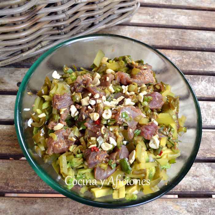 - Cinco minutos antes de comer añadir el atún al bol de la soja y la cebolla, dejar marinar el pescado un par de minutos.