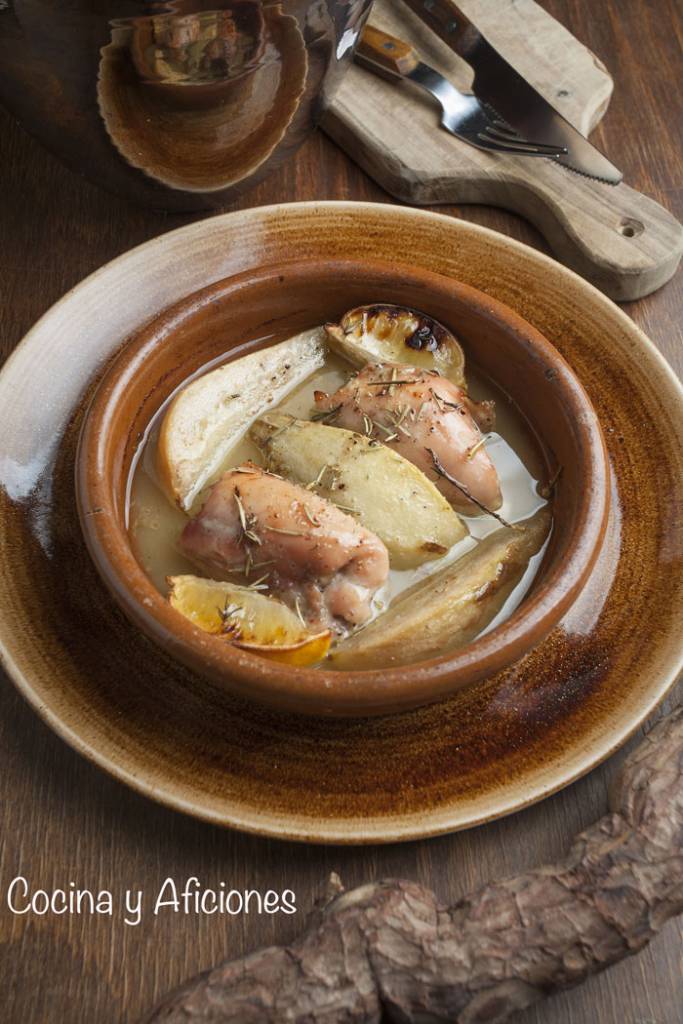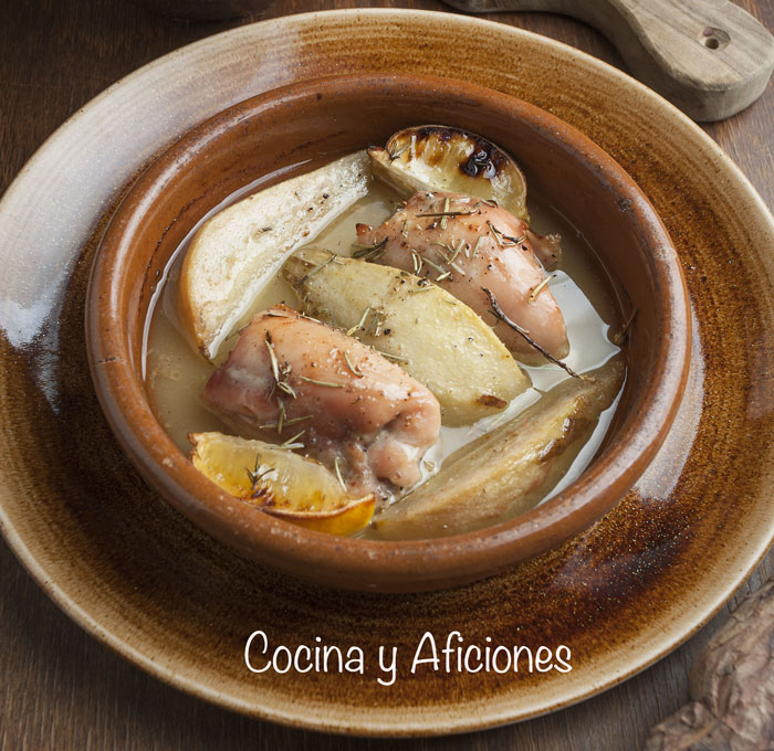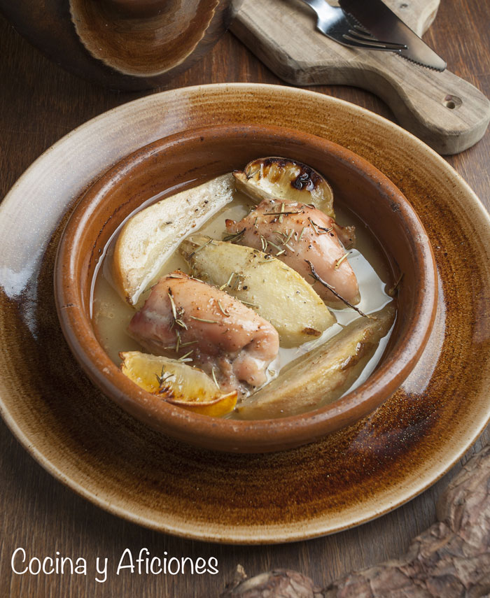 Pollo (contramuslos) asado con peras y limón, una receta sencilla