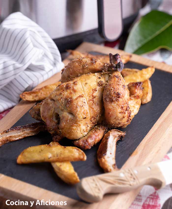 Desde que tengo la Air fryer procuro hacer el pollo en ella, además sale estupendo y acompañado de una guarnición también en esta estupenda maquina no se puede comer mas saludable