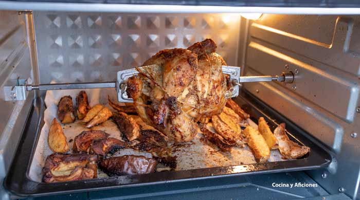 – Encajamos la varilla en los soportes y lo metemos en el horno de freidora de aire en el programa de asado al ast: 180º – 40 minutos, a los 20 abrimos el horno y comprobamos el punto, lo volvemos a bañar con el aderezo, seguimos cocinando hasta que este tierno.