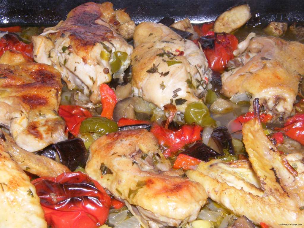 Partimos de todo crudo ponemos en una bandeja de horno grande, la berenjena, nos manchamos las manos de aceite y la frotamos para que se aceite ligeramente, esparcimos la cebolla y el puerro y colocamos encima el pollo con la piel para abajo. En los huecos metemos los tomates enteros, yo no les quito la piel para que no se deshagan, además son muy pequeños.
