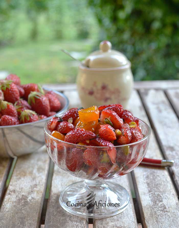 Este “Postre de fresas, kumquats y pistachos” es pura primavera con la fruta reina de la temporada como protagonista, una maravilla que compre en el mercadillo de la Casa de Campo de Madrid, pequeñas con olor y sabor, deliciosas y novedosas hacía mucho tiempo que no disfrutaba de unas fresitas tan ricas, su aroma me trasporta a mi infancia cuando las fresas llegan del huerto a la mesa.