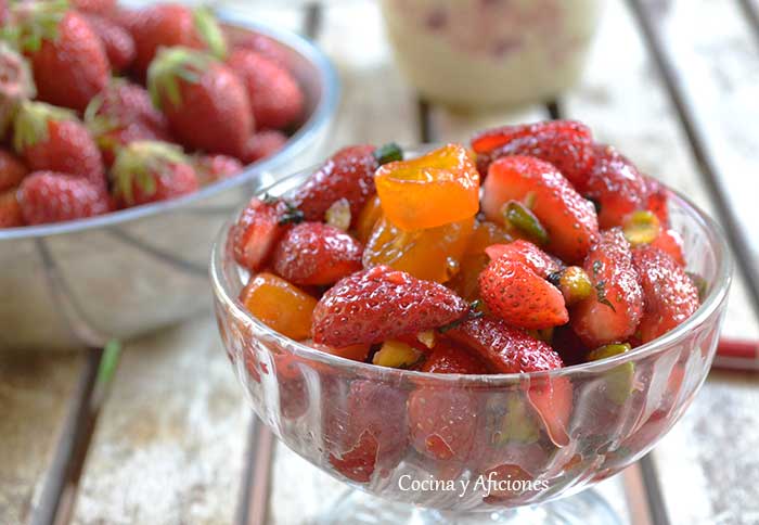 Para las fresas: 600 g de fresas, 100 g de pistachos, azúcar al gusto, 1 c/s de aceite ocal, hojas de menta, 1 vaso de chupito de ron (tu marca preferida).