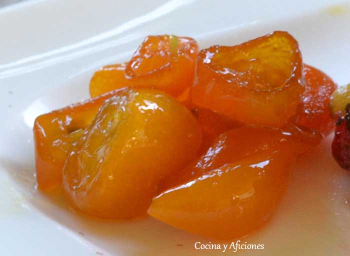 En el momento que el agua desaparezca, los kunquats estén tiernos, brillantes y traslúcidos estarán en su punto, apaga y deja enfriar.