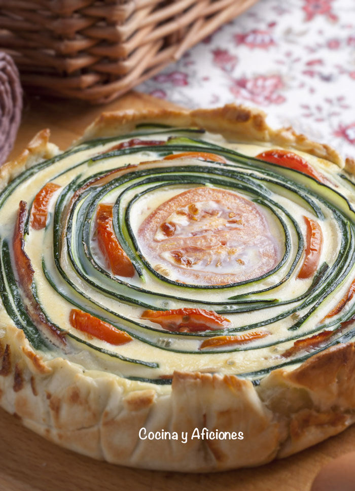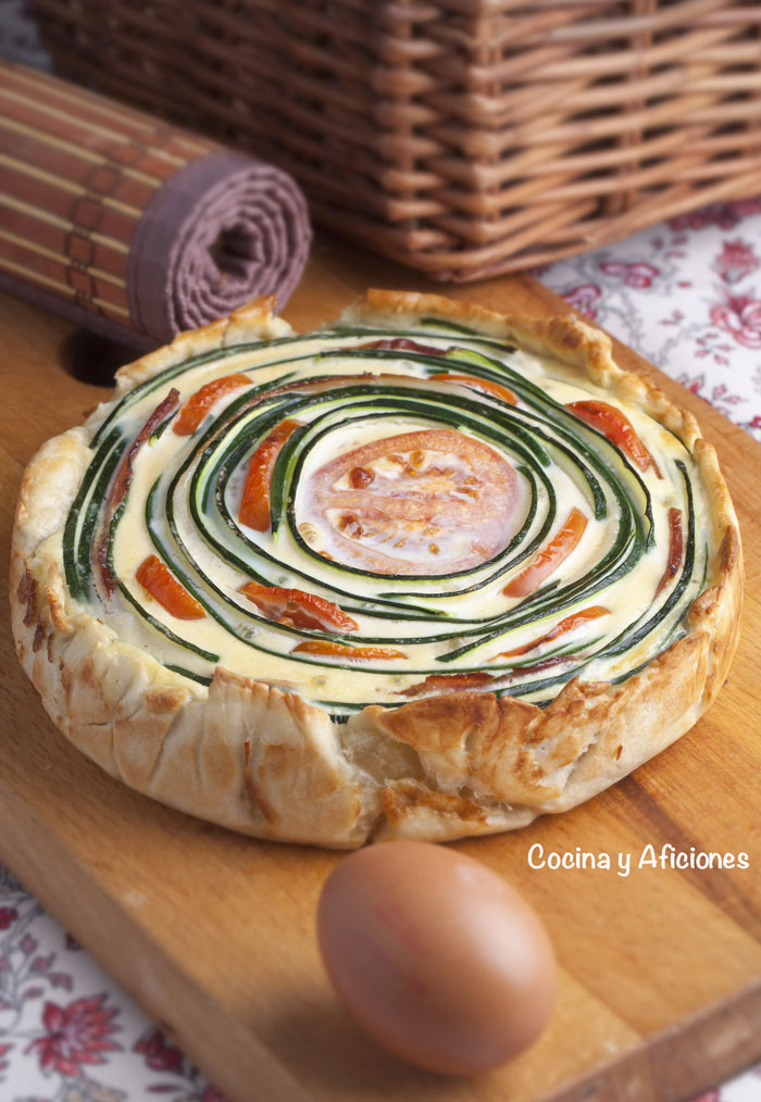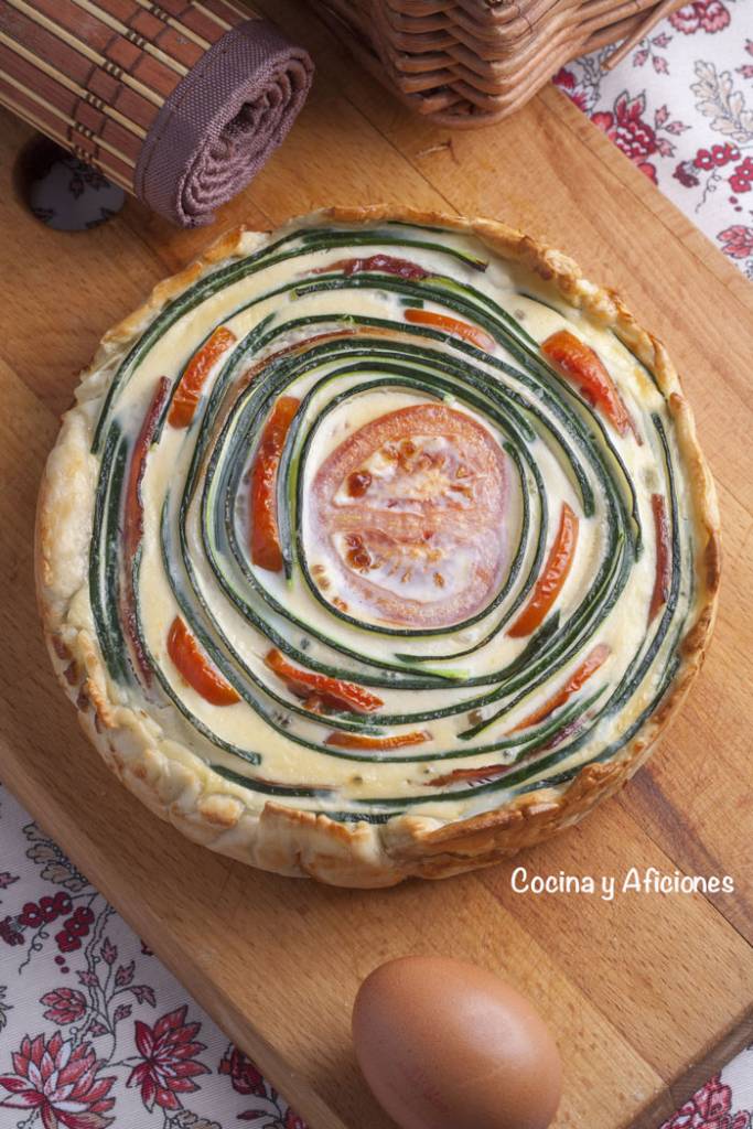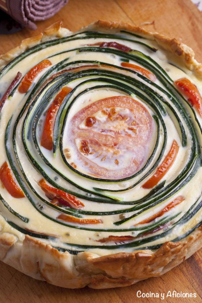 Esta quiche está inspirada en los tians provenzales, unas tartas de verduras que preparan en el país vecino que son absolutamente deliciosas y coloridas, se trata de colocar las verduras en forma ordenada, en filas o círculos, pero siguiendo una pauta.