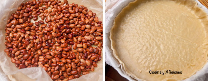 - Pincha la masa con la ayuda de un tenedor y cubrirla con papel de cocina después añádele cualquier legumbre que tengas por casa y métela en la nevera durante 20 minutos para que se asiente