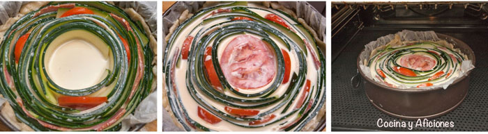 - Con paciencia y cuidado ve colocando las rodajas de calabacín formando un círculo, empieza colocándolas pegadas al borde y continua hacia el centro, formando círculos.