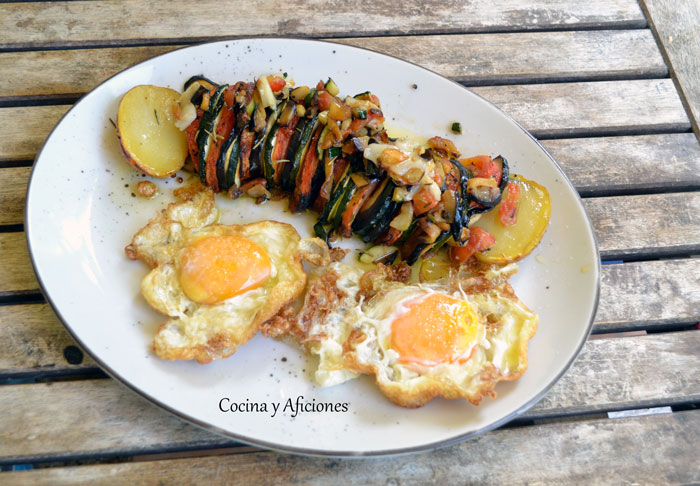 Se trata dos señores huevos fritos de corral con unas cuantas verduras bien colocadas con el objetivo de lograr además de un buen sabor una presentación preciosa. Solo nos falta una buena barra de pan y un buen vino que junto mis huevos y la ratatouille forman un trinomio perfecto e increíblemente delicioso.