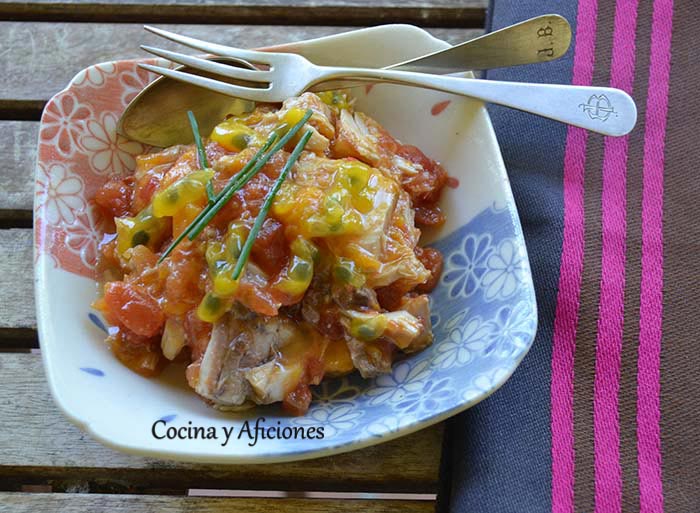 Esta ensalada de Ensalada de bonito con picadillo de tomates y maracuýa es casi una versión de la receta: Bonito glaseado con picadillo de tomates y maracuyá, receta paso a paso., solamente hemos cambiado el glaseado por un aliño y ¡¡milagro!! el resultado es un plato bastante diferente.