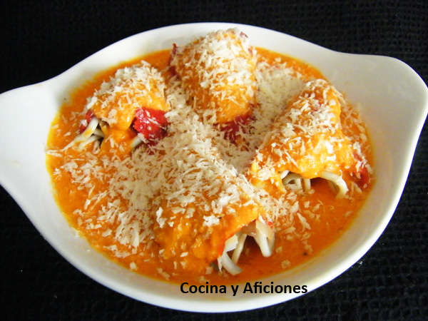 Cannolis de brandada de bacalao con crema de pimiento