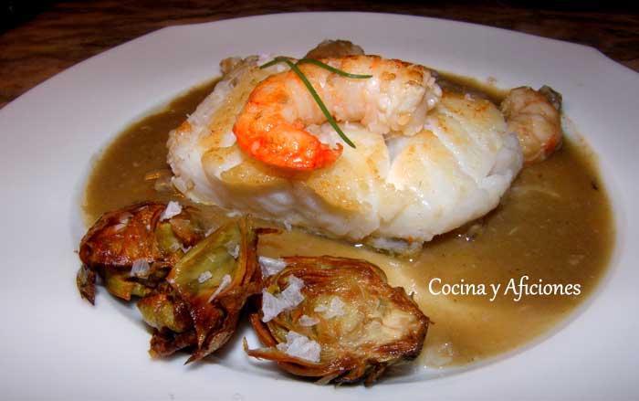 Bacalao Skrei con alcachofas fritas y en salsa de berberechos y gambas