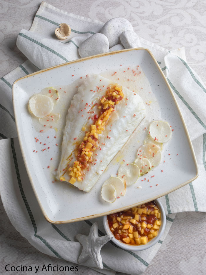 Lomo de bacalao en papillote con nabos y vinagreta de mango y fresas