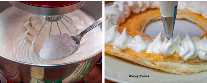 - pon la base de hojaldre con la parte más plana para arriba y con la ayuda de la manga pastelera de nata reparte el relleno por encima.