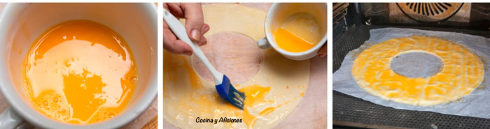 - Vuelve a hacer el agujero central, pero además pincela con huevo batido la superficie, espolvorea un poco de azúcar glass