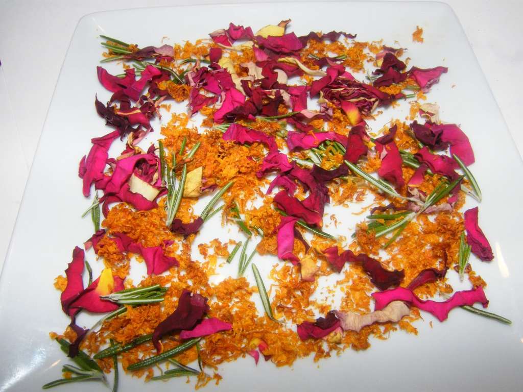 • Rallamos la piel de la naranja y la ponemos en un plato con los pétalos de rosa y el romero. Dejamos que seque toda la noche.