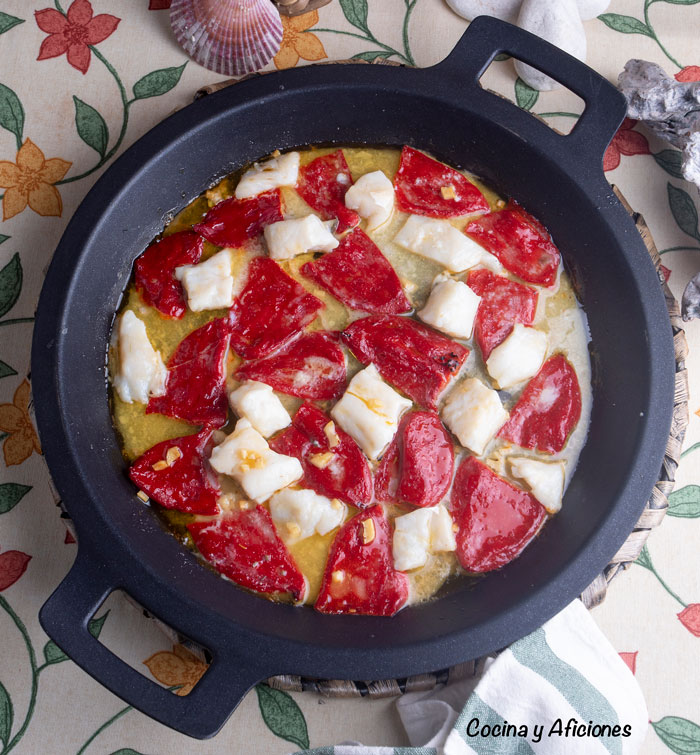 No tiene ningún misterio, vamos a preparar una chilindrón de pimientos con sus ajitos, añadimos el bacalao tres meneos y cinco minutos de fuego y listos para comer.