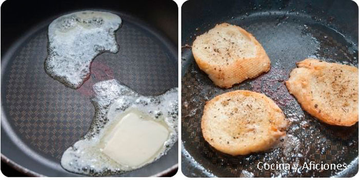 - Metemos las rodajas de pan y dejamos que se doren a fuego medio.