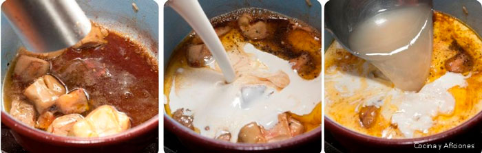 - Incorporamos la nata y el caldo, mezclamos bien y dejamos cocinar a fuego medio, no debemos de olvidar mover la crema de vez en cuando para que no se pegue.