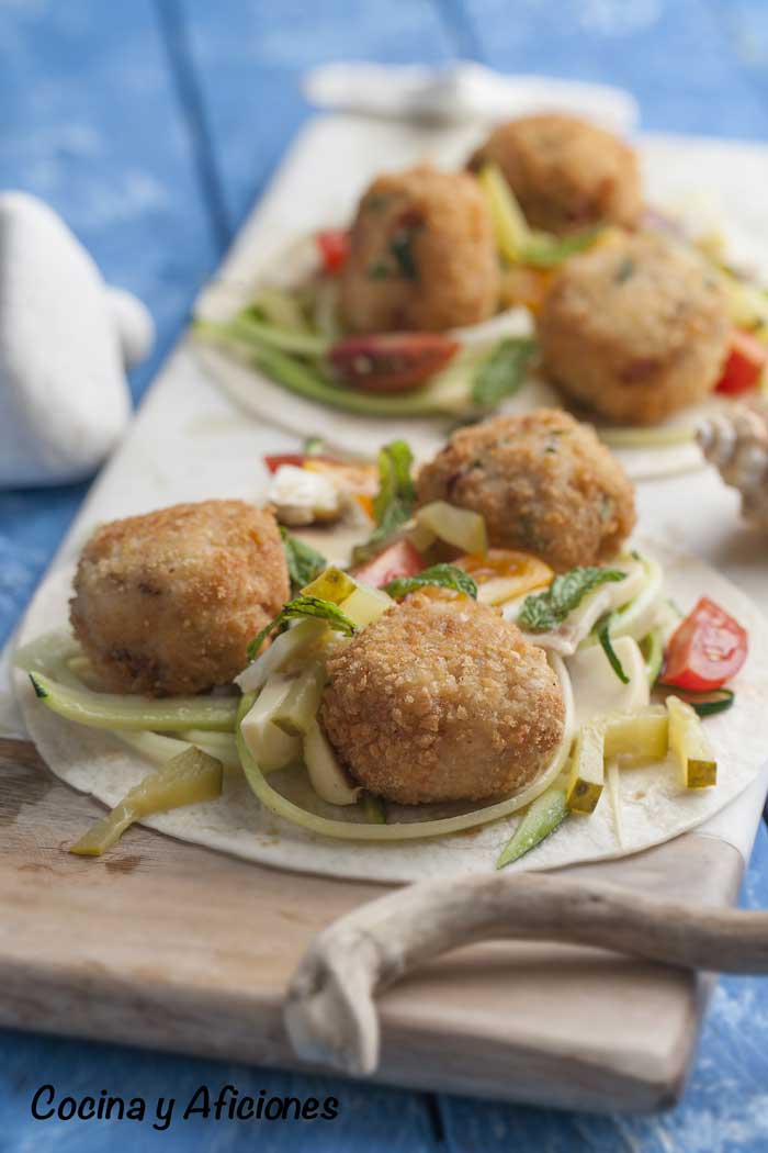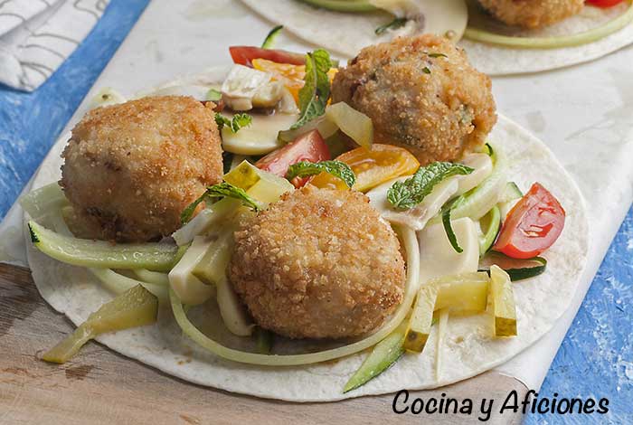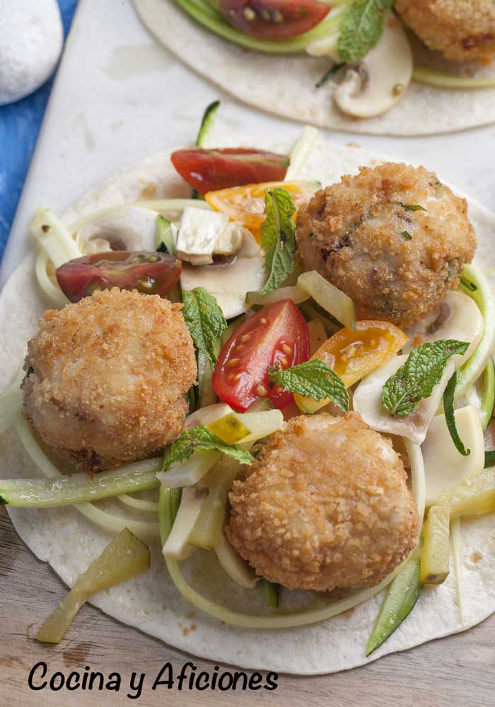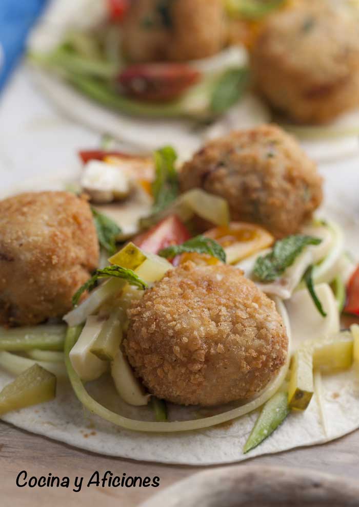 ponemos las tortillas en un plato colocamos encima las albóndigas las rodeamos con el acompañamiento y todas las hierbas que te apetezca añadirles.