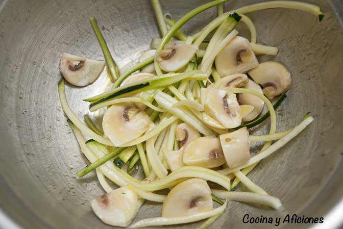 Cortar el calabacín en tiras finas como si fueran espaguetis; picar el pepinillo agridulce en taquitos pequeños; el tomate cherry en octavos y los champiñones en lámina, Poner en un bol y aliñar con el AOVE sal y zumo de limón