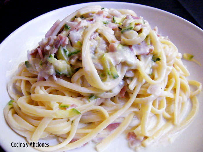 Esta receta de pasta es muy simple, no tiene grandes ingredientes que le aporten sabores excepcionales pero en su conjunto resulta muy aceptable, es más, yo diría que buenísima, fina y equilibrada. Es muy fácil de elaborar y para los ingredientes que utilizamos y su coste la verdad es que el resultado es óptimo. Está claro que este es un plato único, que no es nada ligero ni bajo en calorías, ya que sus ingredientes son todos miembros honoríficos de la lista de alimentos que no debemos comer: panceta, bacón, nata, quesos grasos (¡que ricos todos!), es un plato homenaje, de esos caprichos que nos damos de vez en cuando, cuando somos muy buenos y nos merecemos un premio.