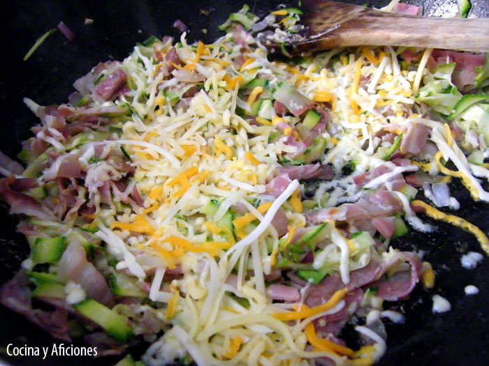 Ponemos a sofreír la cebolla a fuego lento con una pizca de sal, cuando comience a blanquear le añadimos el bacón y la panceta, dejamos cocinar un par de minutos y le agregamos el calabacín, removemos y cinco minutos, le añadimos la mitad del paquete de los tres quesos, la nata y el caldo.