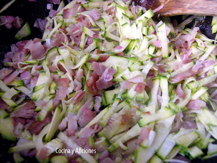 Cortamos la cebolla en brunoise pequeña, el bacón y la panceta en tiras finas. El calabacín lo hacemos láminas con la mandolina y luego lo cortamos en tiritas.