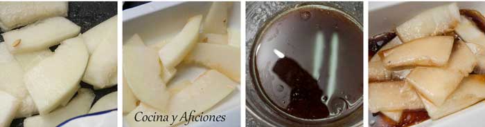 3.- Corta el melón en láminas finas y ponlas en un bol, riégalo con la marinada, tápalo con papel film y déjalo macerar un par de horas.
