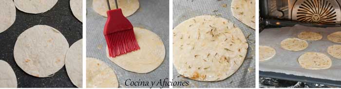 1.- Pinta con mantequilla la tortilla, espolvoréala con tomillo y polvo de guindilla y métela al horno a 180ºC durante 2/3 minutos, hasta que estén bien dorada crujiente.