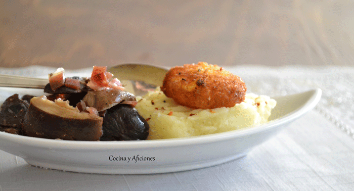 La dividimos por la mitad y llenamos un lado con setas cuidando que se vea el jamón y con los ajos dorados por encima y en el otro el puré espolvoreado con polvo de guindilla que le dé el toque picanton.